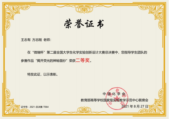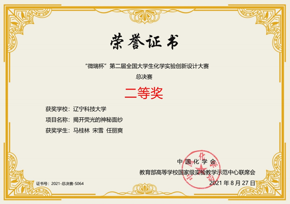 8月25日-27日,“微瑞杯”第二届全国大学生化学实验创新设计竞赛全国总决赛在青岛科技大学举行。开云登陆入口化学工程学院应用化学系马桂林、宋雪、任丽爽3人团队的科普实验作品“揭开荧光的神秘面纱”(指导老师:王志有、方志刚)获二等奖。