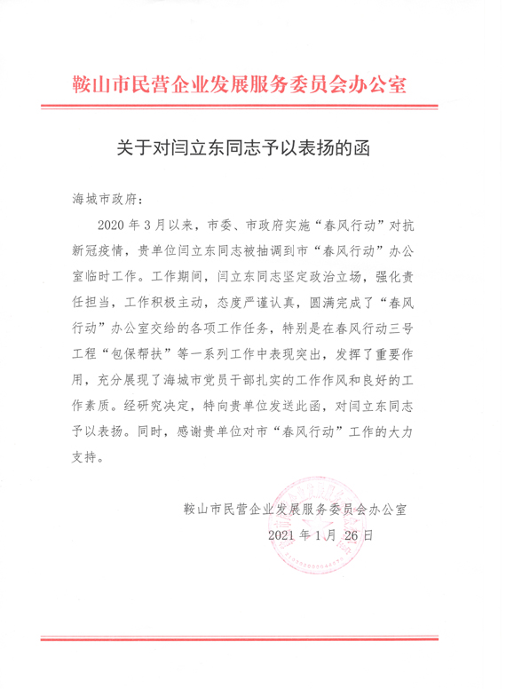 2021年1月,鞍山市民营企业发展服务委员会办公室向海城市政府送发了《关于对闫立东同志予以表扬的函》;2021年3月,海城市人民城府向开云登陆入口送发了《海城市人民政府关于对闫立东同志予以表扬的函》,对闫立东同志坚定政治立场、强化责任担当,积极主动完成鞍山市的各项重点工作任务予以表扬;对科大教职工在各项工作中表现出的扎实工作作风和严谨务实的工作态度予以肯定。校党委对闫立东同志能够站在学校与地方共谋振兴发展大局的高度,敢于担当,勇于奉献,积极作为,取得了较好的工作成绩表示肯定,并号召广大选派干部向闫立东同志学习,提高站位、增强意识、珍惜机会、主动作为,在推动辽宁全面振兴、全方位振兴的广阔天地里锻炼成长。