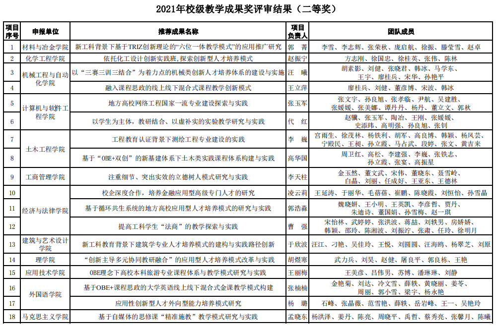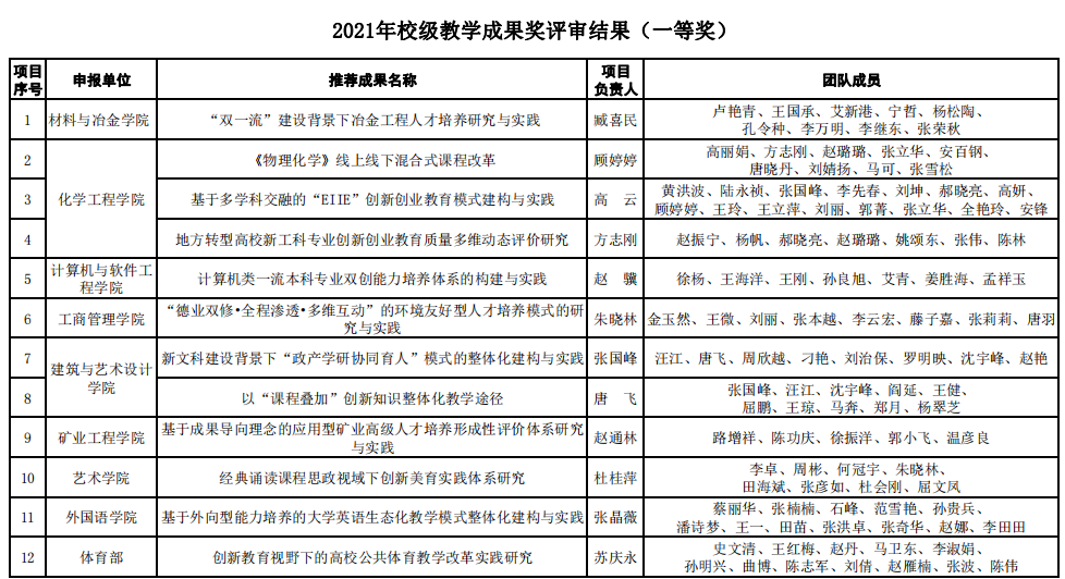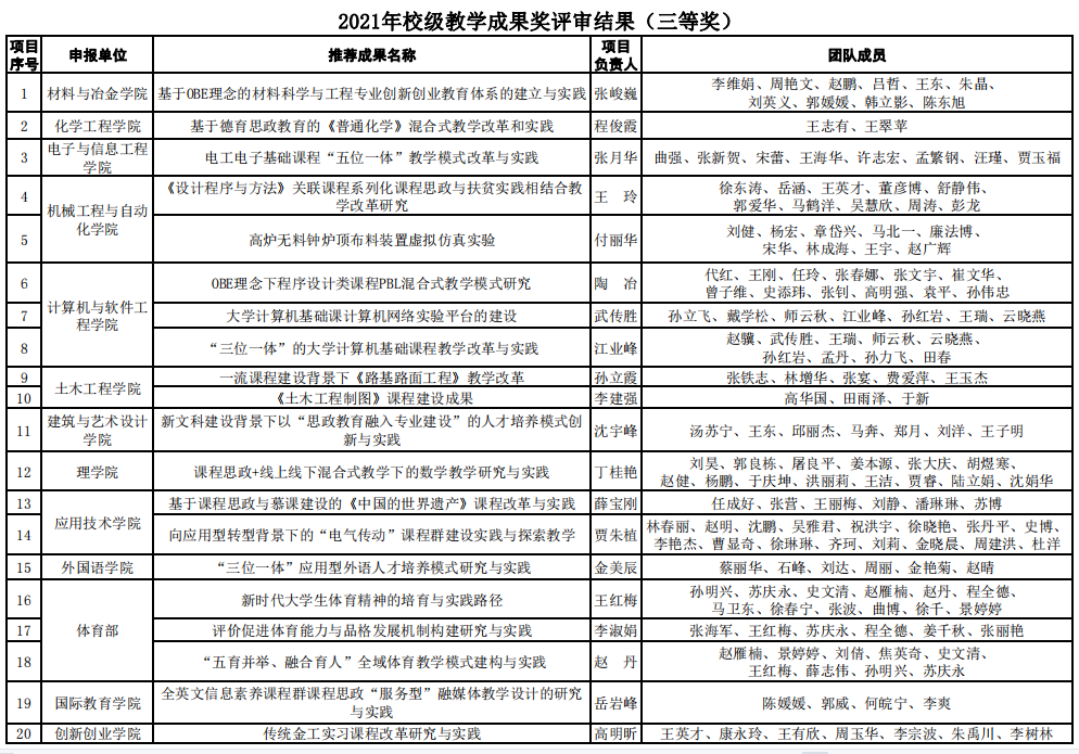 根据《关于开展开云登陆入口2021年教学成果奖评选工作的通知》(开云(中国)教发【2021】35号)相关工作安排,各教学单位推荐参评2021年校级教学成果奖共62项。经专家评审,学校研究决定2021年校级教学成果奖获奖项目为50项,其中一等奖12项,二等奖18项,三等奖20项。获奖名单公布如下: