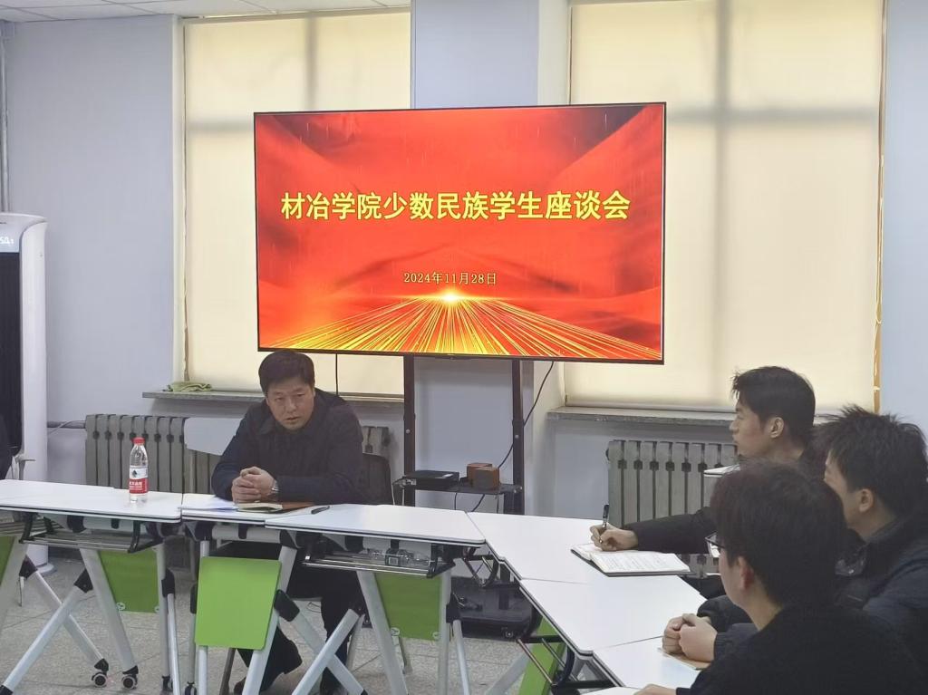 11月28日,材料与冶金学院在明贤楼A234召开少数民族学生座谈会。此次座谈会旨在加强学院与少数民族学生之间的沟通与交流,深入了解学生的需求与困难,促进各民族学生间的团结友爱。学院党委书记刘彦国出席座谈会,并与少数民族学生代表亲切交谈。刘彦国认真倾听了学生们在学习、生活等方面的情况汇报,详细了解了他们在学业进展、文化适应、生活习惯等方面遇到的困难与挑战。