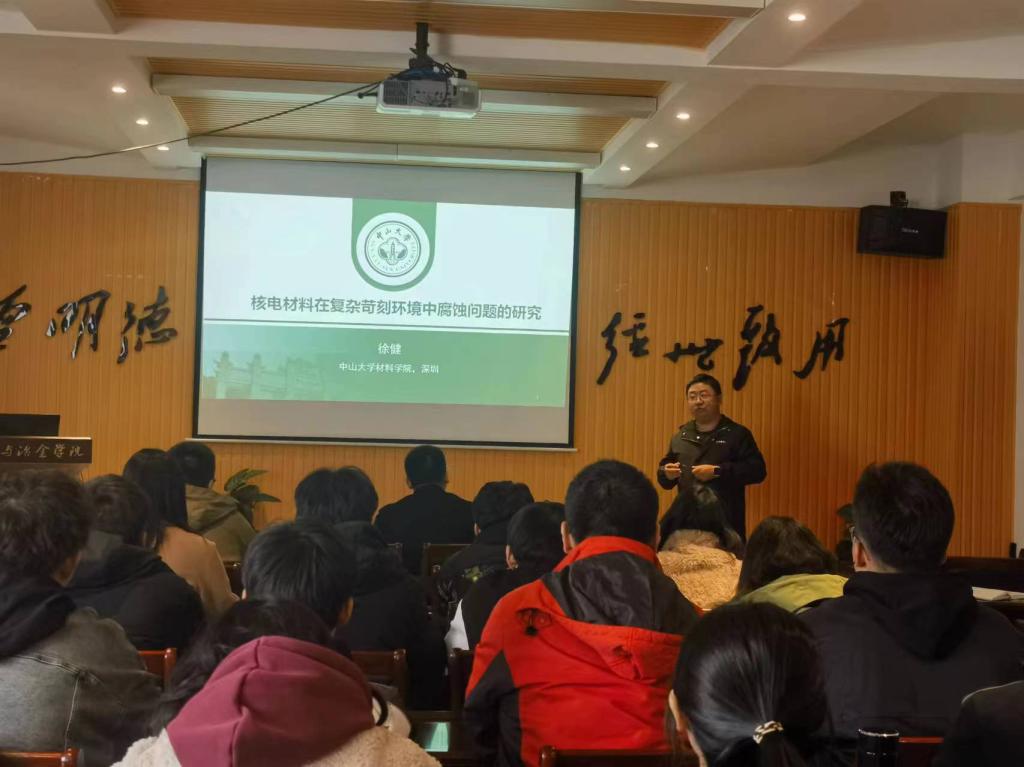 报告中,徐健教授分享了压水堆核电站在长周期服役过程中,核电材料因腐蚀问题严重威胁核电站服役安全的经典案例,并展示了其所在科研团队目前已取得的初步研究成果,重点讲解了系统探究腐蚀污垢在传热管表面及传热管与支撑处之间梅花孔处生长与沉积行为及相关机理。徐健教授高屋建瓴、深入浅出的报告,不仅开拓了研究生的学术视野,还激发了学生的科研热情。