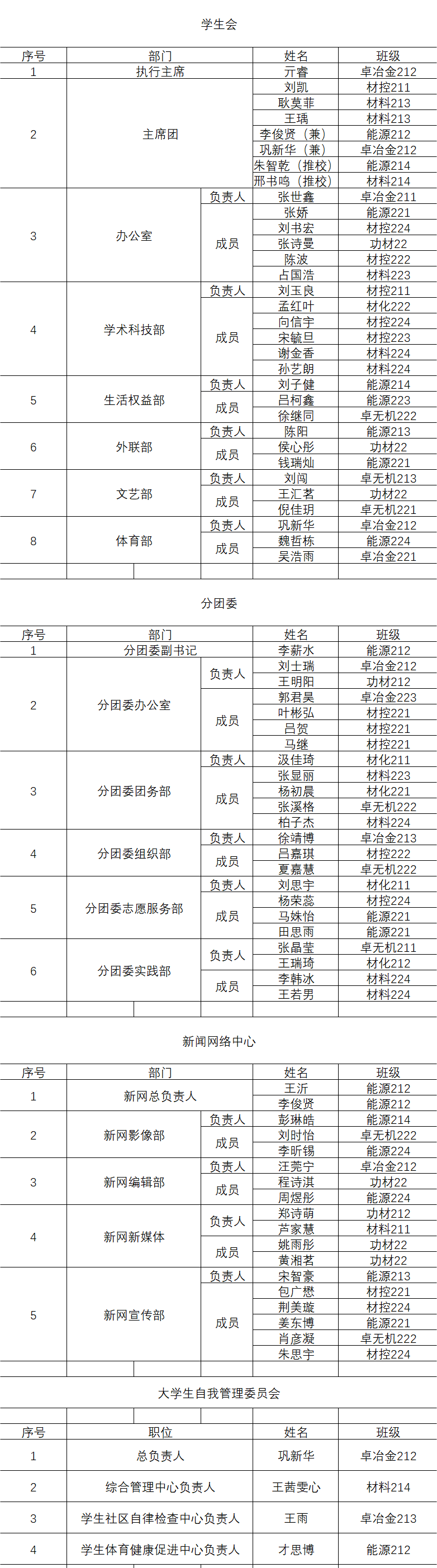 为进一步加强学院学生管理工作建设、增强学生组织的凝聚力和向心力、督促学生自我勉励、创造更好的学院氛围,拟定亓睿等77名同学为开云登陆入口材料与冶金学院第十四届团委、学生会、新闻网络中心、自我管理委员会成员。