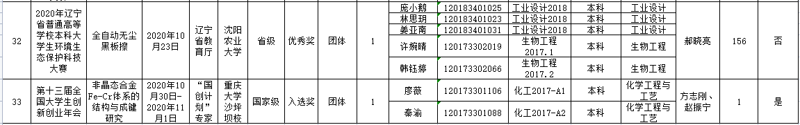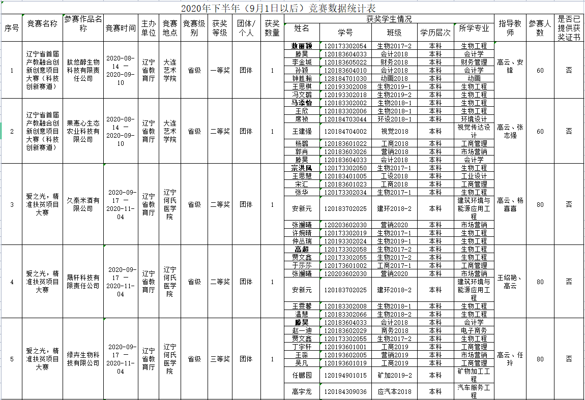 化工学院2020下半年学生创新创业竞赛获奖情况统计表