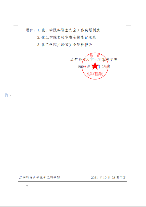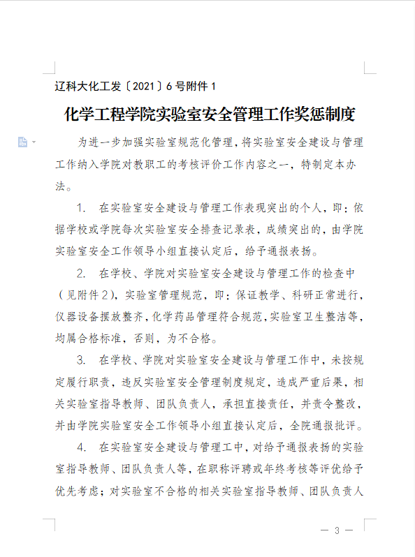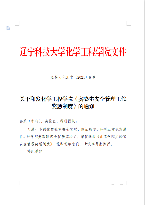 关于印发化学工程学院《实验室安全管理工作奖惩制度》的通知