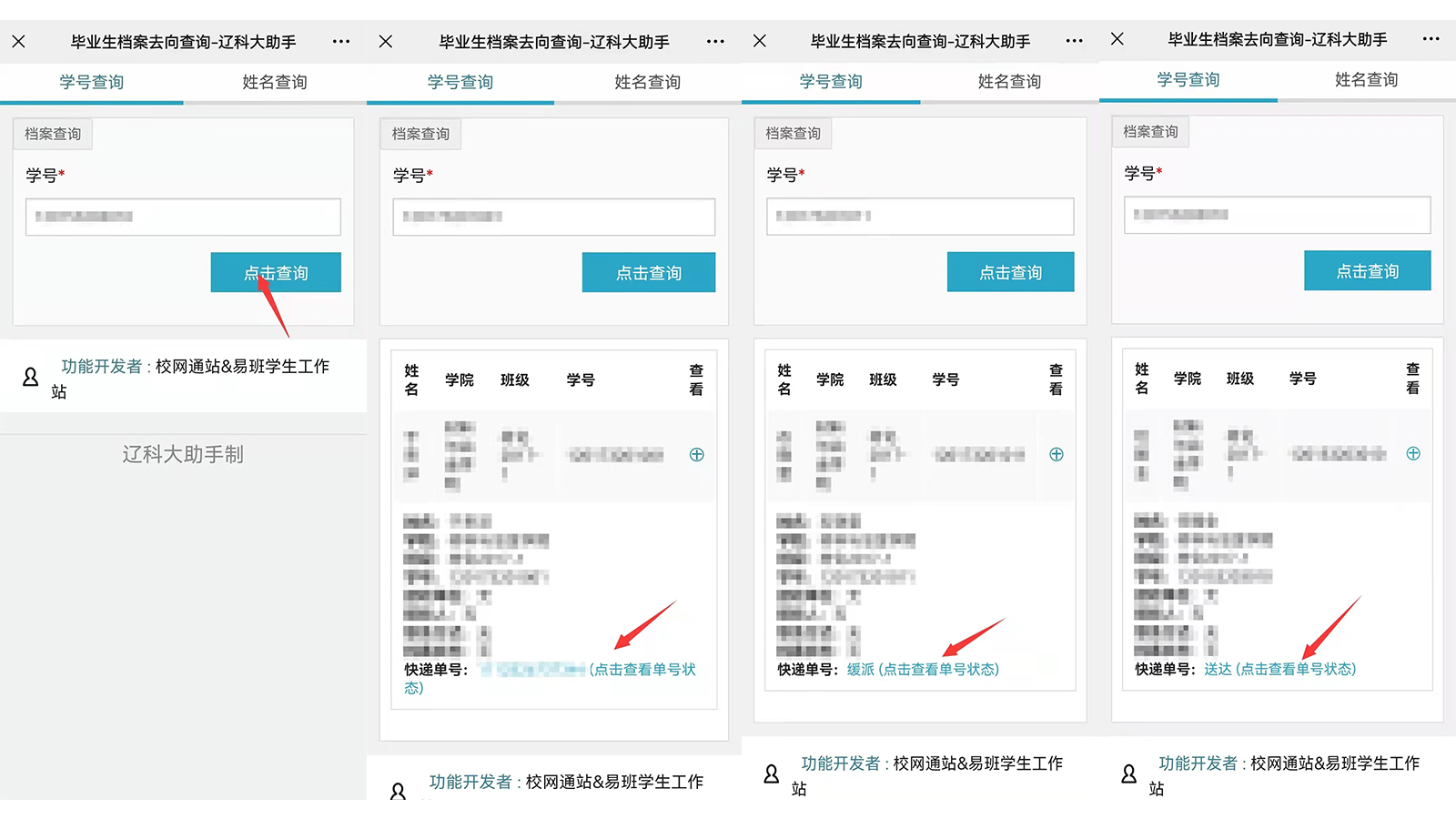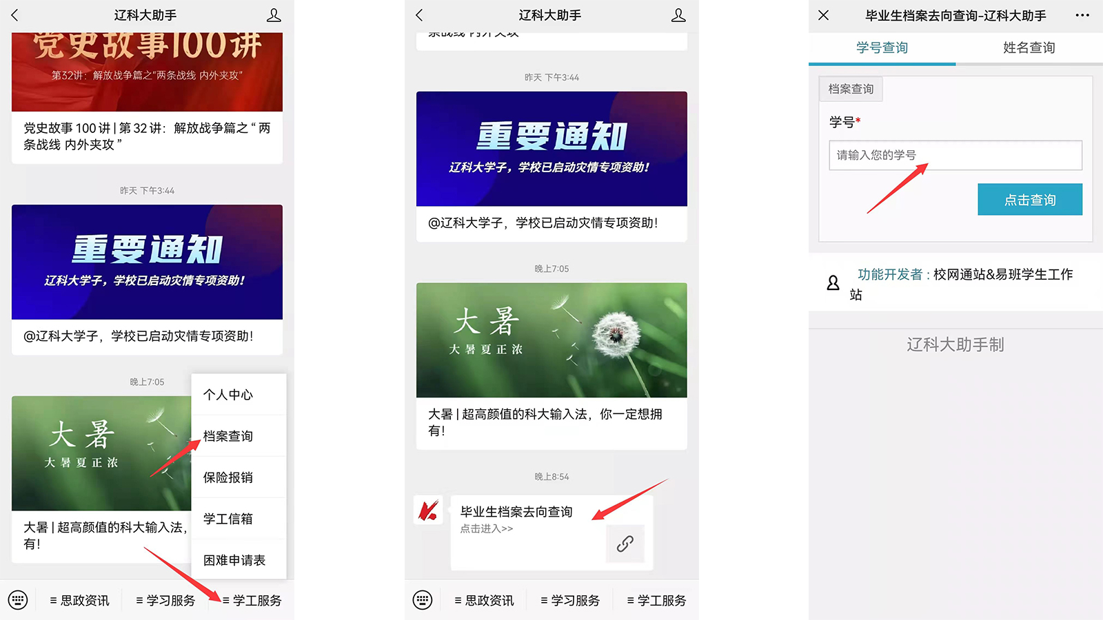 点击菜单栏中的“学工服务”栏目后,点击档案查询,即可查询毕业生档案去向。