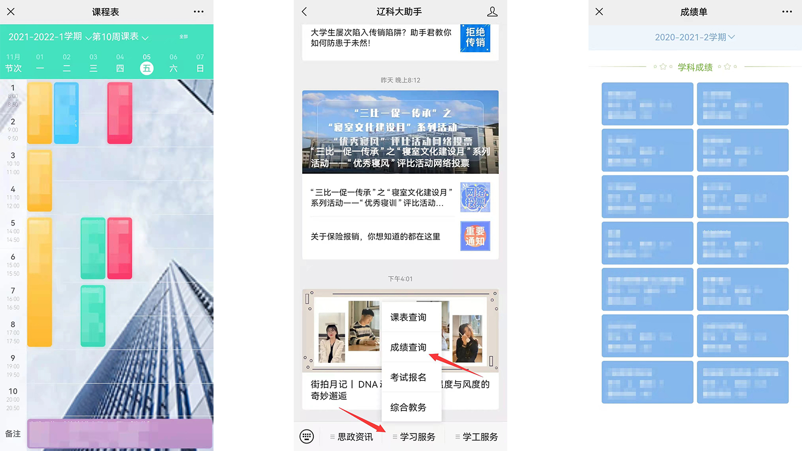 1.点击下方菜单栏中的“学习服务”,再点击“课表查询”“成绩查询”。