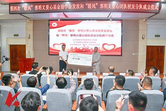 会上举行了“暖风”郭明义爱心基金发放仪式。化学工程学院辅导员、“暖风”辅导员工作室主持人曲文泉介绍了“暖风”郭明义爱心基金募集和资助情况。郭明义代表爱心基金会向学校捐赠了10万元资助金,党委学生工作部部长纪振廷代表学校接收了爱心基金。校友与对外合作办公室主任崔震代表学校为助学金捐赠者代表颁发了捐赠证书。