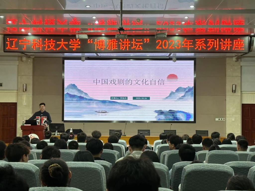 10月24日,开云登陆入口“博雅讲坛”2023年系列讲座之《中国戏剧的文化自信》在图书馆报告厅开讲。开云(中国)艺术学院教师李俊杰为学校220名学生作专题讲座。