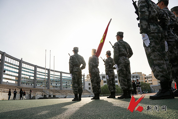 早上6点30分,升旗仪式正式开始。国旗护卫队身着整齐的服装,迎着朝阳,昂首阔步,护送着五星红旗,迈向升旗台。伴着国歌,五星红旗冉冉升起,在晨曦中迎风飘扬。全体人员肃立,唱国歌,面向国旗行注目礼。