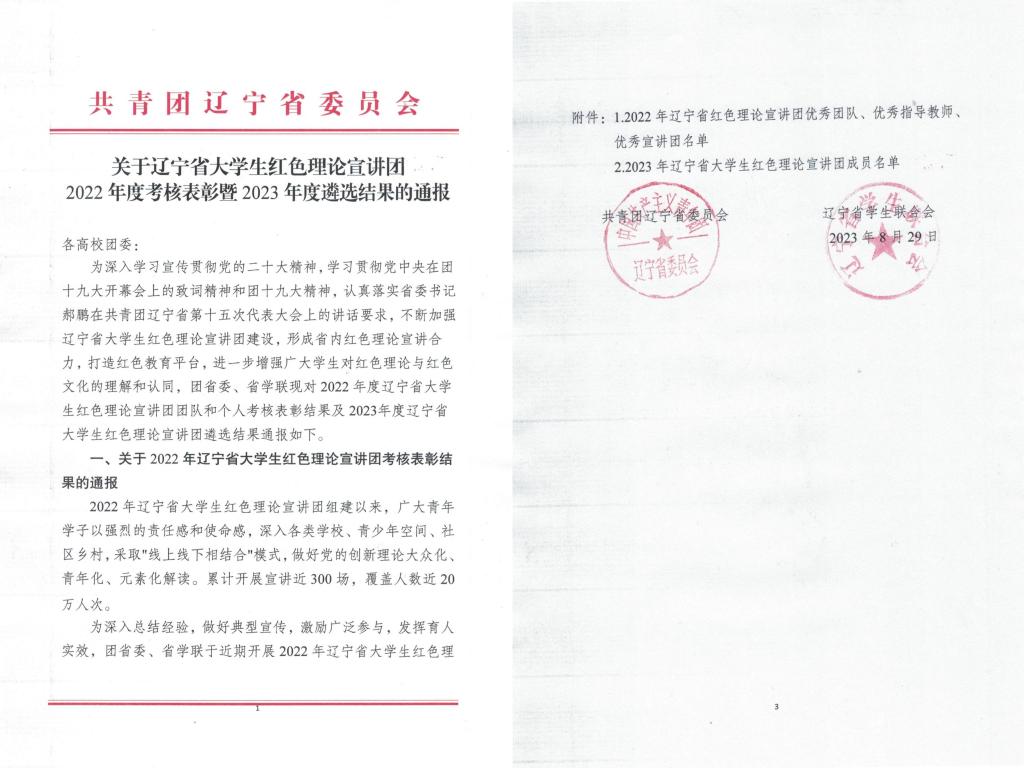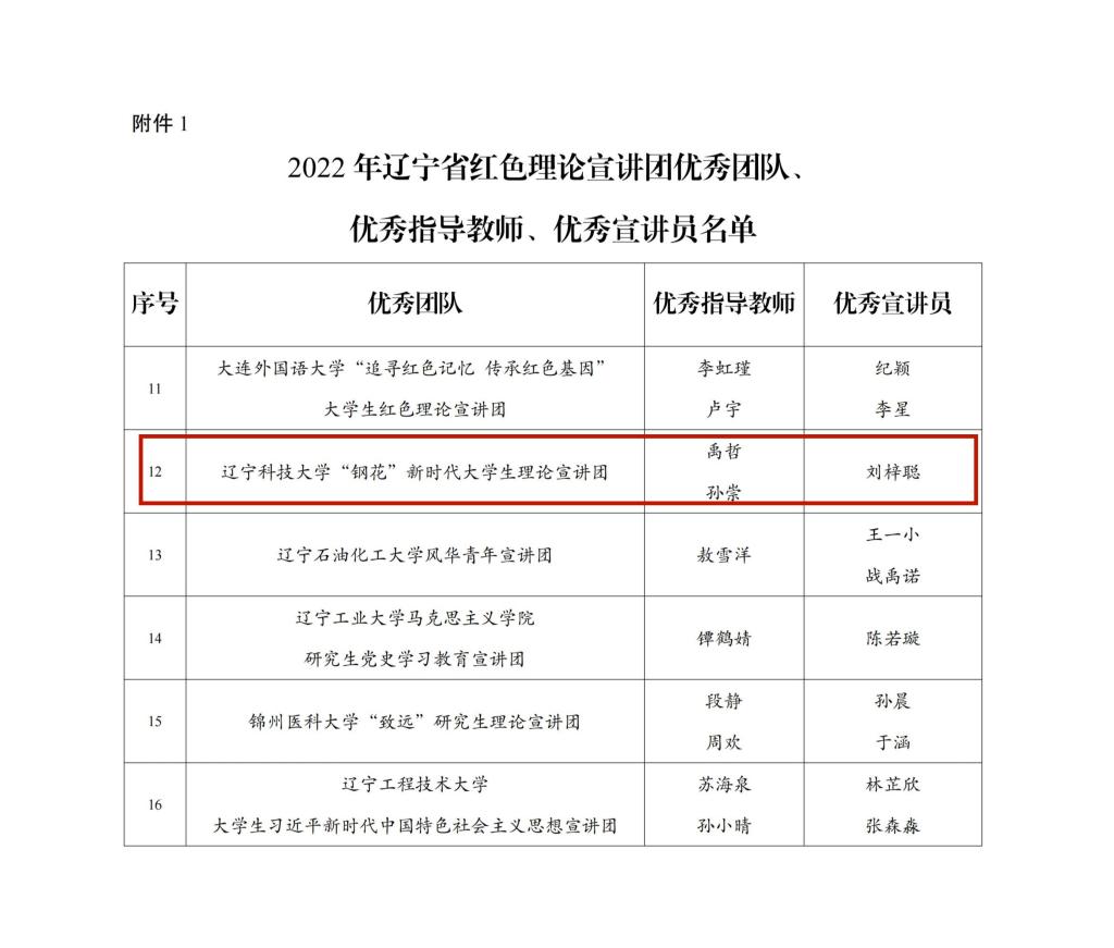 近日,共青团辽宁省委员会、辽宁省学生联合会联合通报2022年辽宁省大学生红色理论宣讲团考核表彰结果,开云登陆入口“钢花”新时代大学生理论宣讲团获评2022年辽宁省大学生红色理论宣讲团优秀团队。宣讲团负责人刘梓聪获评“优秀宣讲员”荣誉称号。