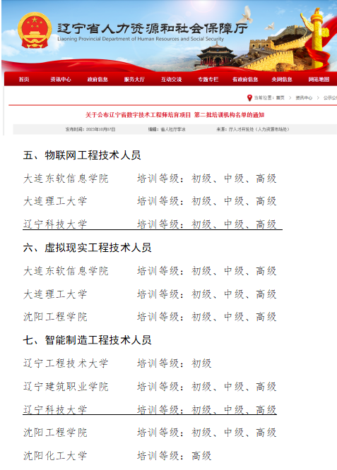 按照辽宁省人社厅《专业技术人才知识更新工程实施方案》和《数字技术工程师培育项目实施办法》的要求,应用技术学院与继续教育学院积极组织相关专业系进行材料申报,经鞍山市人社局推荐,辽宁省人社厅组织专家评议,最终包括大连理工大学、东北财经大学、辽宁工程技术大学在内的辽宁省11所高校获批该项资质。