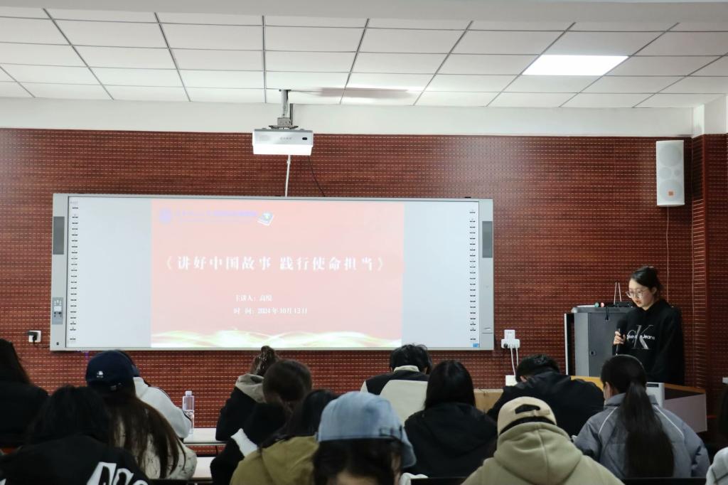 学院学生第三党支部宣传委员、“青年·说”大学生理论宣讲团成员高悦作题为“讲好中国故事,践行使命担当”的主题宣讲。她围绕中国精神的含义、时代价值以及新时代青年的做法三个方面,向同学们阐述了讲好中国故事的意义与方法。她表示,新时代青年应与时俱进,不断突破,探索讲好中国故事的新形式,让宣讲更具传播性、积极性,用最有成效的途径讲好中国故事,为实现中华民族伟大复兴的中国梦添砖加瓦。