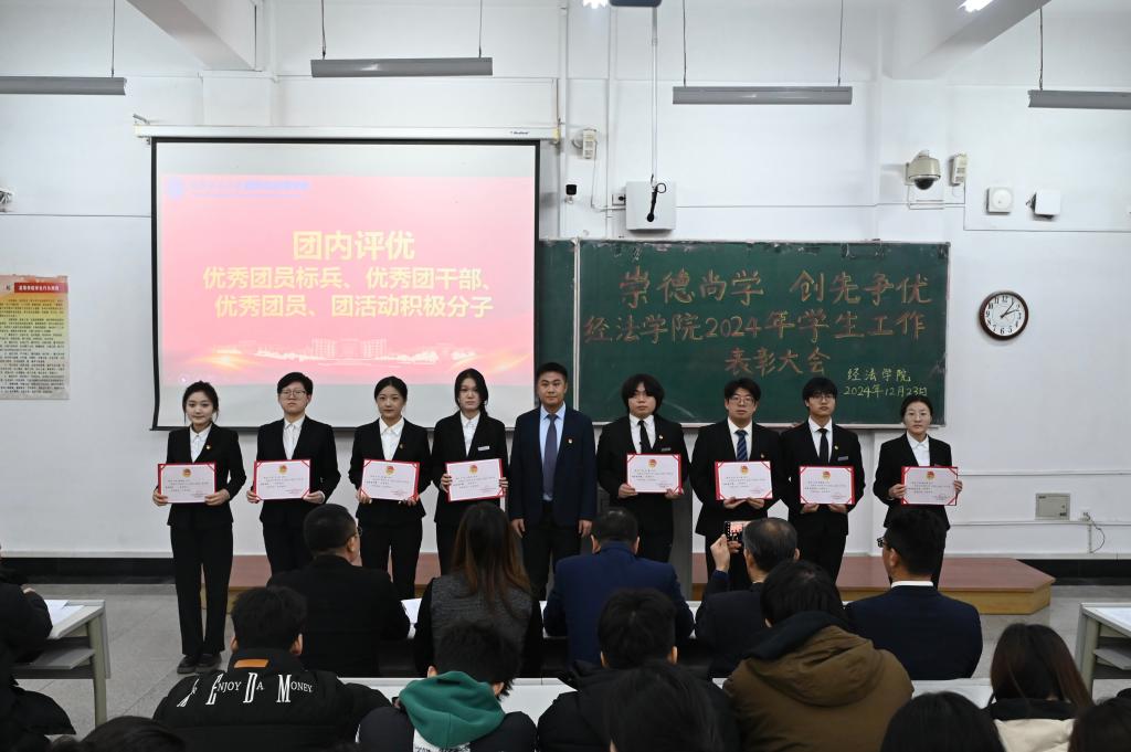 12月23日,经法学院于博学楼A101召开“崇德尚学 创先争优”2024年学生工作表彰大会。会议由学院党委书记赵智博主持,学院领导、各系主任、班主任、辅导员、获奖学生代表及2024级全体学生参加。
