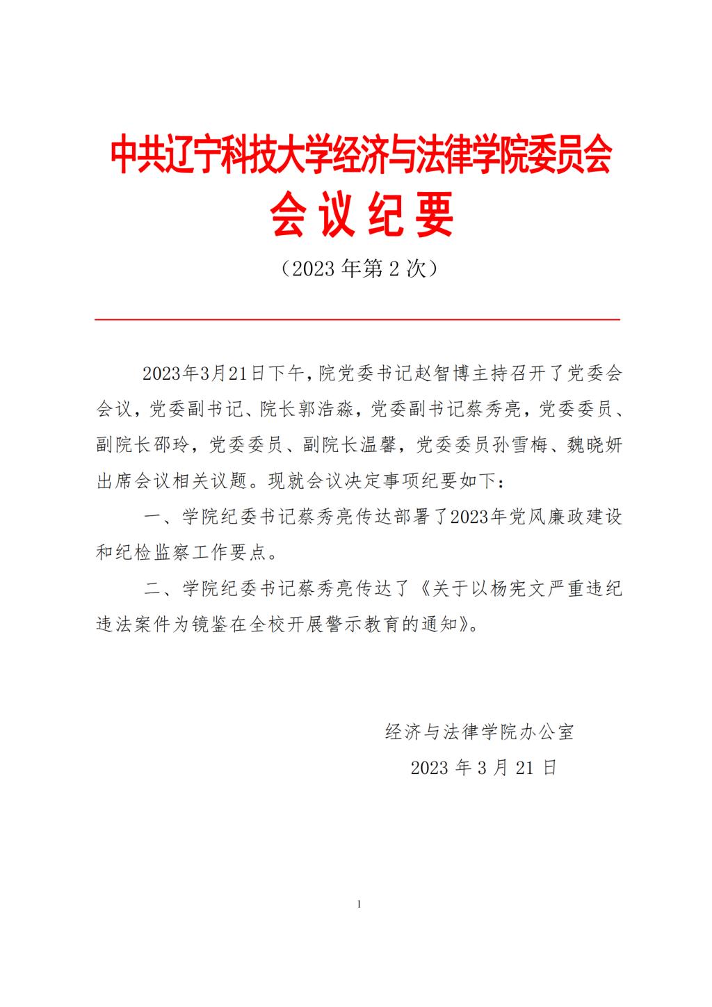 中共开云登陆入口经济与法律学院委员会会议纪要(2023年第2次)