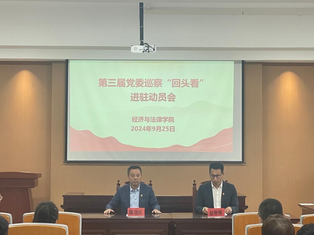 2024年9月25日下午,经法学院在博识楼A402会议室召开第三届党委巡察“回头看”工作动员会。会议由学院党委书记赵智博主持,第三届党委巡察组全体成员、经法学院全体教师及部分学生代表参加会议。