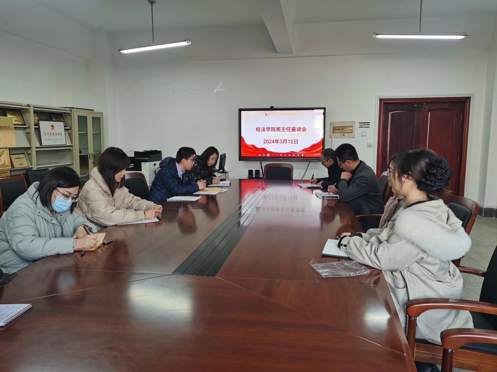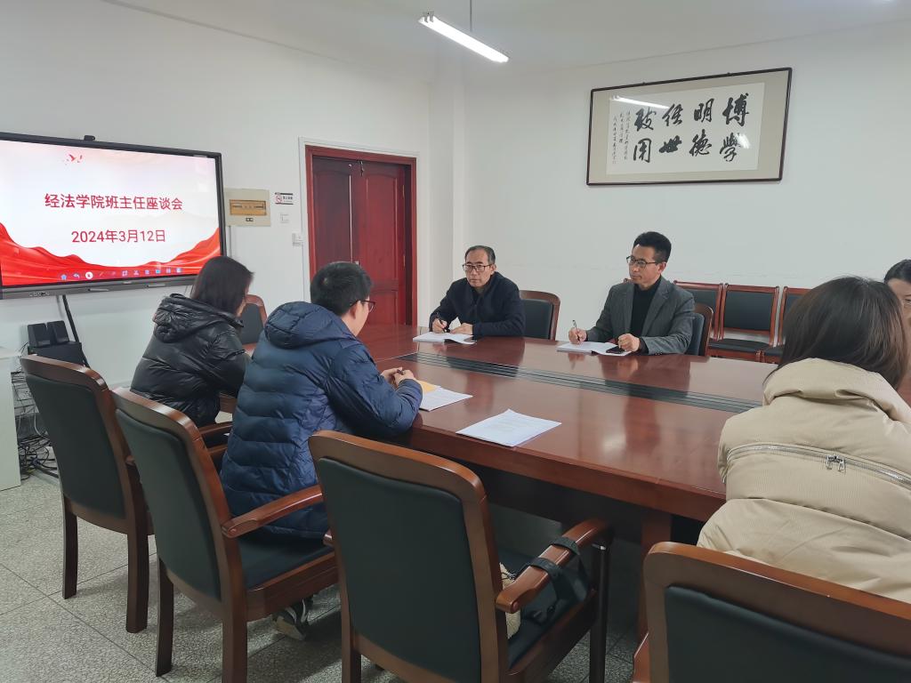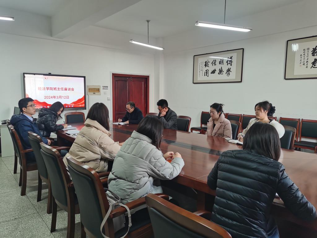 3月12日,经法学院于博识楼A315召开2023级班主任座谈会议,会议由学院党委副书记张国华主持,学院党委书记赵智博、学办主任齐艳萍以及李俊等7位2023级班主任参加了会议。