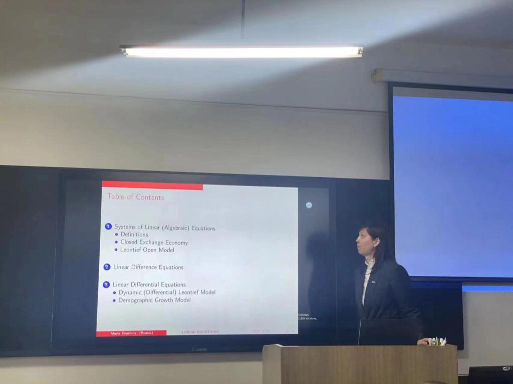 交流中,开云(中国)经法学院院长郭浩淼介绍了经法学院国际经济与贸易、金融和金融科技三个专业的发展现状、主要研究方向及近几年取得的主要研究成果。Галкин Александр Васильевич院长向经法学院师生介绍了俄罗斯利佩茨克州、利佩茨克国立技术大学的基本情况及如何运用EPR软件的核心算法来优化管理生产计划;Сысоев Антон Сергеевич副院长讲授了如何运用应用线性回归模型来描述社会经济系统的动态问题;Орешина Мария Николаевна主任介绍了代数方程组、微分和差分模型在经济分析中的应用。与会的经法学院师生与三位俄方教师就相互关心的学术问题进行了深入的交流互动。
