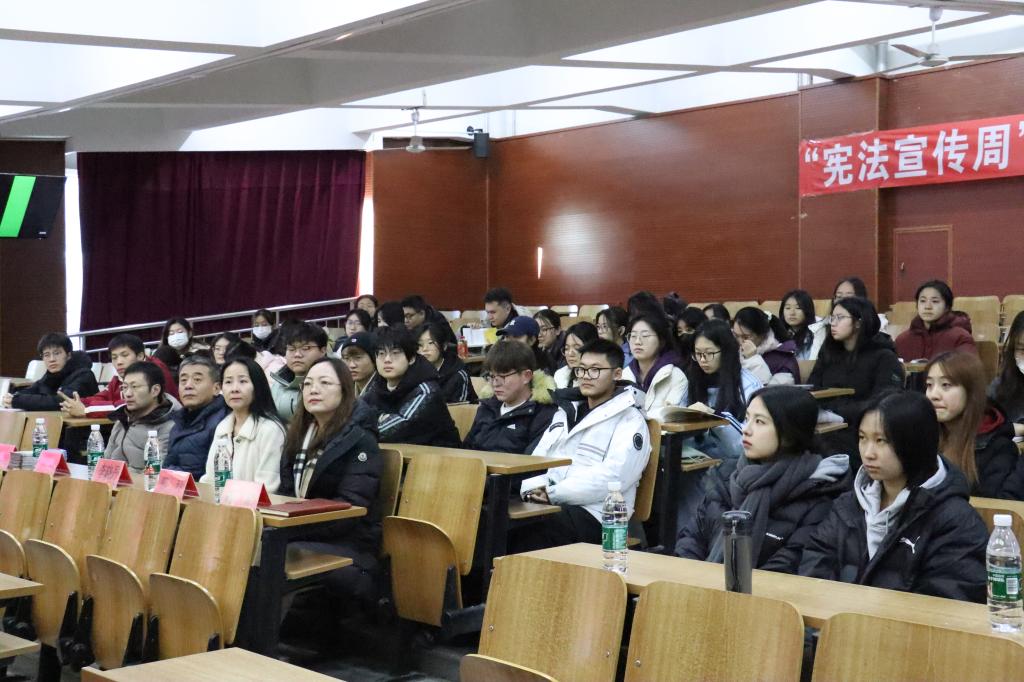 经法学院副院长邵玲致辞。她阐述了宪法在当今社会中的重要地位,明确表示学院将不遗余力地加强宪法宣传教育,大力弘扬社会主义法治精神,为建设文明和谐的法治校园贡献力量。