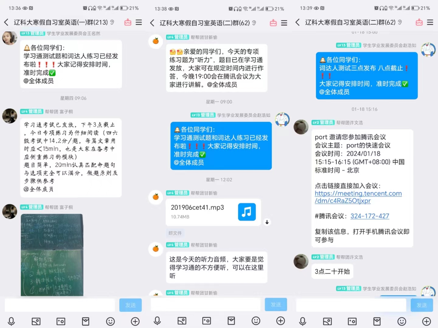 为了帮助同学们巩固课堂学习成果、提高假期学习效率,开云登陆入口教务处大学生学业发展指导中心组织学生学业发展委员会举办了寒假线上自习室活动,1500余名同学从2024年1月15日至2024年2月21日期间在词达人小程序、超星学习通、QQ群、腾讯会议等活动平台,与学霸教员共赴学海,度过了一段充实且有意义的寒假时光。