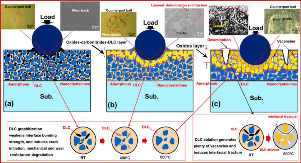 图2高温环境Ti-Al-Si-C-N涂层的摩擦损伤与润滑失效机理
