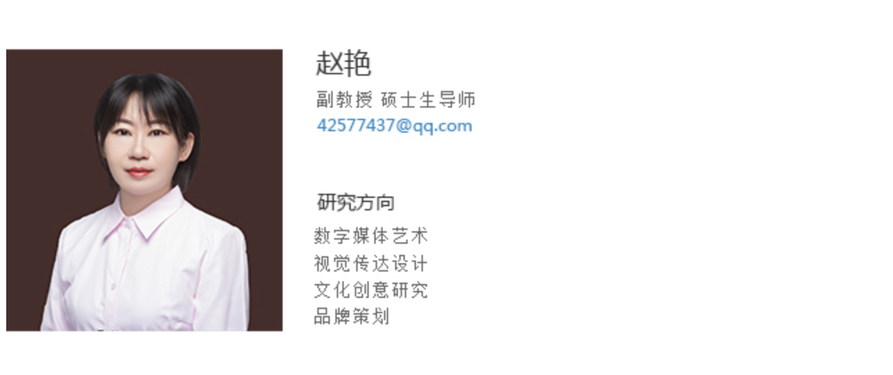 赵艳副教授,大连工业大学设计学硕士。曾担任中国大学生广告艺术节学院奖评委;多年从事文化创意设计领域研究,出版《中国传统文化创意设计》等著作;撰写文化创意设计相关论文多篇;《中华优秀传统文化的创造性转化与创新性发展研究》等多项文化研究课题获批辽宁省社会科学规划基金等立项,相关教改课题获批国家教育部产学合作育人项目;指导学生获大学生创新创业训练省级项目4项;获靳埭强全球华人设计大奖银奖、全国公共机构节能宣传大赛二等奖;全国大学生广告艺术大赛国家级一等奖、二等奖、三等奖多次;中国大学生计算机大赛二等奖、三等奖多次;红色文化创意大赛等赛事等级奖多项;曾获辽宁省教育软件大赛高教组二等奖、三等奖,全国多媒体课件大赛一等奖、三等奖;辽宁省信息化教育大赛微课组三等奖;校级优秀教案大赛一等奖;校级课堂教学大赛一等奖;校级教学改革与教学建设成果二等奖 ;首届考试方式方法改革试点课程优秀成果一等奖;开云登陆入口第五届“名师示范课”主讲教师;校园先锋工程教学先锋岗;校级教学质量优秀奖。