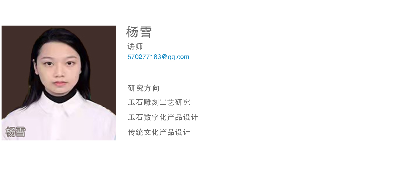 杨雪,助教,开云登陆入口、硕士,设计学专业,主要从事传统手工艺(玉雕方向)产品的设计研究。具有雕塑、玉雕及数字雕刻等实践经验。在专业刊物发表专业研究及教学研究论文两篇。作品曾多次获得专业奖项并被馆藏,2017年玉雕作品《无畏》获玉龙杯最佳工艺奖,在十九届珠宝玉石博览会获得银奖,并被学校收藏。同年,评为市级工艺美术大师。2019年玉雕作品《雪貂仕女》获得工美新力量银奖。2020年作品《达摩》获得“金牡丹”杯文化创意大赛银奖,并被藏家收藏。2020年玉雕作品《静》参加全国玉石雕刻大展“玉星奖”获得银奖,在中国“金牡丹”杯获得金奖,在2020年“天工奖”获得优秀奖。