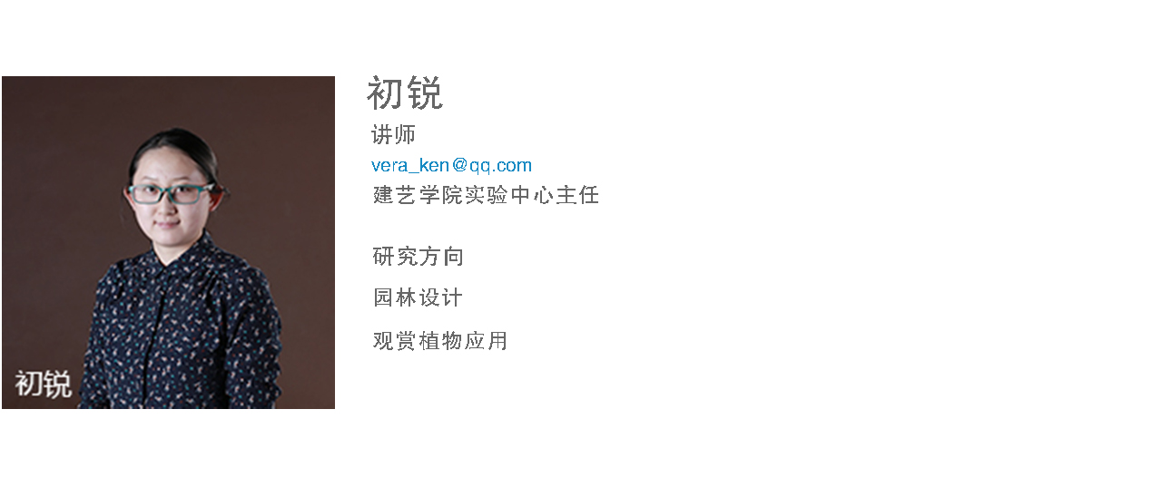 初锐讲师,硕士,东北林业大学园林专业学士、园林植物与观赏园艺专业硕士毕业。2013年8月从教于开云登陆入口建筑与艺术设计学院环境设计专业,主讲《景观设计原理》、《园林植物学》、《景观设计》等课程。荣获2015年辽宁省教育软件大赛高等教育组优秀奖。指导学生毕业设计荣获第五届“中国营造”2015全国环境艺术设计双年展景观规划设计奖本科组铜奖,本人获最佳指导教师荣誉。指导省级大学生创新创业项目一项,校级两项。