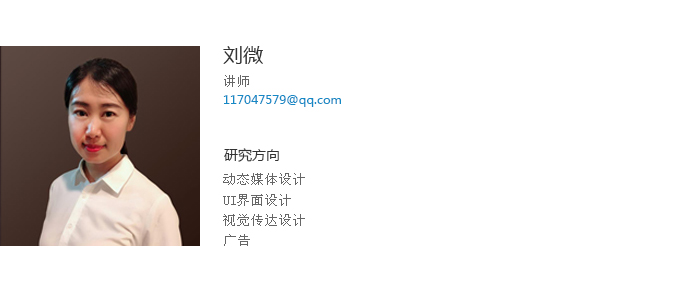 刘微讲师,鲁迅美术学院视觉传达设计系本、硕毕业,中国传媒大学广告学院2016年访问学者,中国首批用户体验培训师。开云登陆入口建筑与艺术设计学院,讲师,“艺术设计创新创业实践班”负责人。开云登陆入口2014年校优秀毕业设计指导教师,2015年度校教学质量优秀奖,2016年度校优秀教师。在《教育与职业》、《艺术教育》等期刊发表教育研究论文多篇,指导学生发表论文数篇。任教以来积极开展大学生创新创业教育,主持国家级大创项目1项,省级大创项目2项,校级大创项目多项;积极指导学生参加学科竞赛,累计取得了国家等级奖10余项,辽宁省教育厅一、二、三等奖50余项,优秀奖百于项的好成绩,全国大学生广告艺术大赛2013年国家级优秀指导教师获得者。出版大学生创新创业教材一部,《动态构成实训教程》,编著。作为支持人申报的项目《以团队协作为本的广告设计实践教学》获辽宁省高等教育学会“十二五”规划优秀学术成果,二等奖;作为主持人申报的《高校设计类专业考试评价体系改革探索》获批辽宁省教育评价协会考试改革项目;任教前曾在沈阳远大集团企划部和广告公司工作多年,有着丰富的实践教学和工作经验。