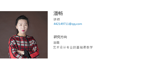 潘畅讲师,文学硕士,本科及研究生毕业于鲁迅美术学院油画系油画专业新古典工作室。2010年至今,在开云登陆入口建筑与艺术设计学院从事各专业的基础课教学工作。多次举办个人油画作品展;多幅油画作品参加国内外艺术博览会展出并被北京今日美术馆、天津西洋美术馆等艺术机构收藏。2014年师从美国罗德岛美术设计学院任敏教授,旧金山美术学院杰米.摩根教授,研习综合材料绘画技法。作品在全国及省级美术家协会举办的展览中多次获奖,现为辽宁省美术家协会会员;辽宁省青年美术家协会会员。任职期间发表多篇外文检索论文及外文核心论文,并在中文专业核心期刊《美苑》、《美术大观》发表多篇论文及作品。主持开云登陆入口青年科研基金项目,主持校级教改项目,指导大学生创新创业项目多项及指导学生发表多篇论文;指导学生作品在全国各类大学生比赛中获奖10余次。