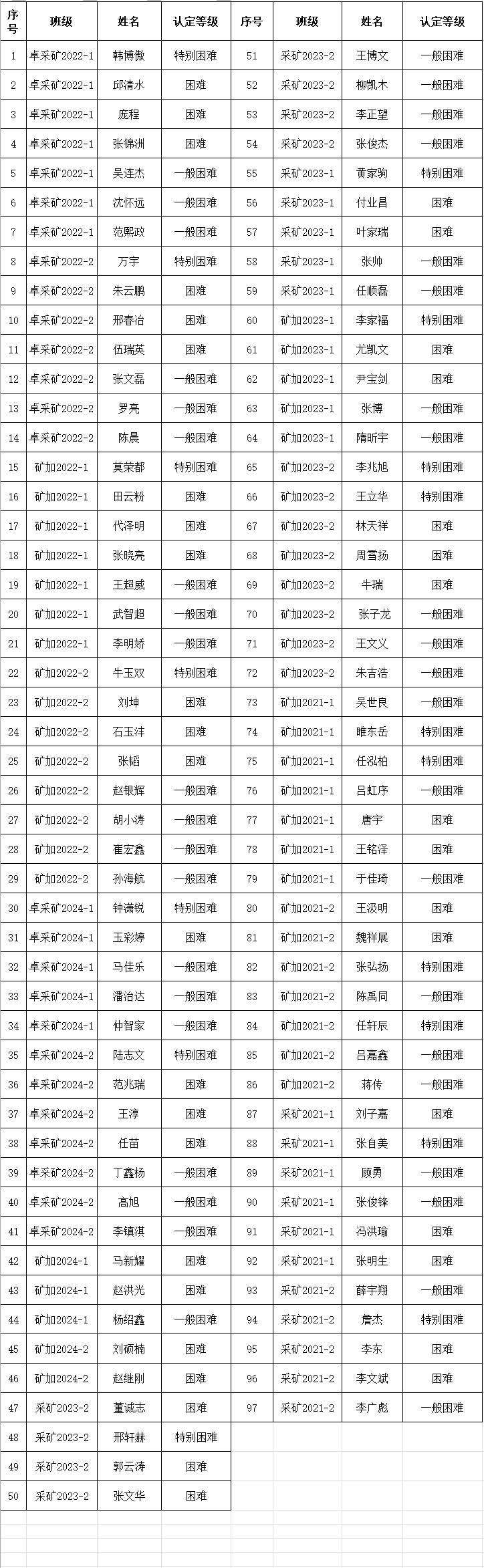 矿业工程学院2024-2025学年家庭经济困难学生认定结果公示