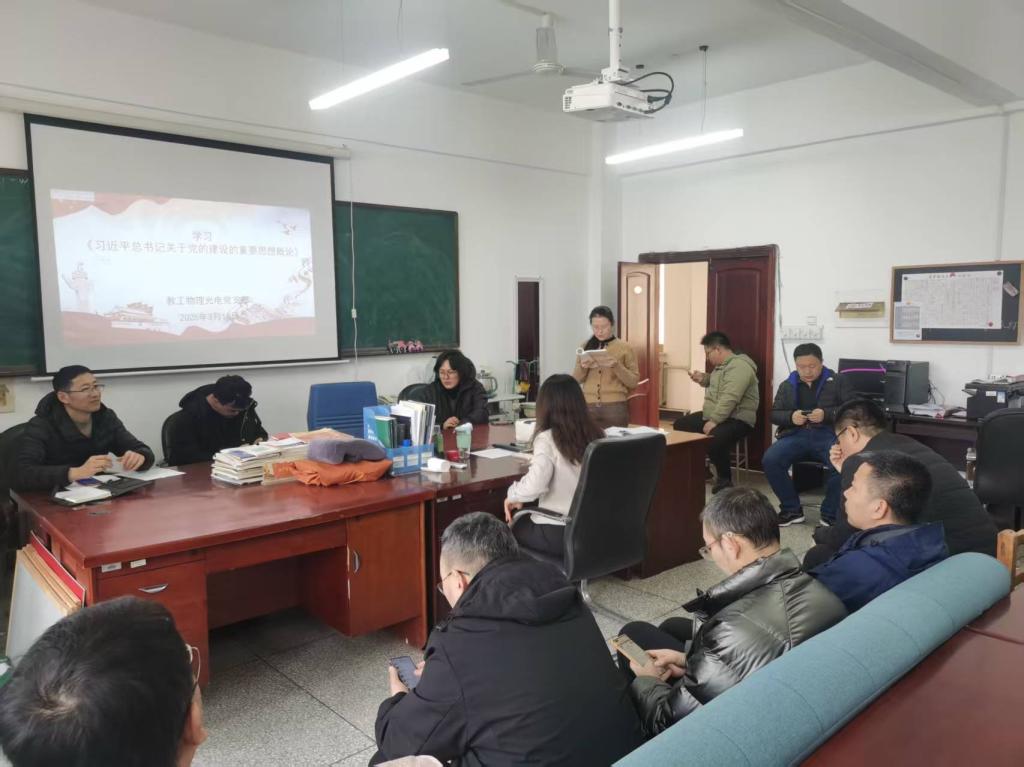 3月18日下午,理学院教工物理光电党支部在B313开展集体学习活动,深入学习《习近平总书记关于党的建设的重要思想概论》第八章“坚持聚天下英才而用之”,并就2025版培养方案“平台课”修订进行研讨。此次会议由党支部书记梁英爽和物理系主任王彪共同主持,支部全体党员教师和非党员教师参加。