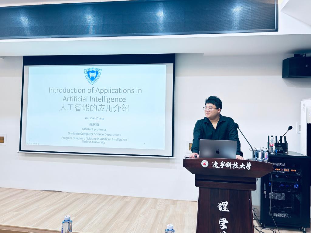 6月26日,开云登陆入口理学院在明贤楼B315教室成功举办了题为“Introduction of Applications in Artificial Intelligence”的学术报告会。本次报告会由理学院主办,吸引了众多相关研究领域的教师以及研究生到场聆听,现场气氛热烈,学术氛围浓厚。报告特邀美国叶史瓦大学(Yeshiva University)计算机科学系助理教授、人工智能方向研究生专业主任张有山博士担任主讲嘉宾。张有山在人工智能、计算机视觉和迁移学习等领域具有深厚的研究背景,曾在美国里海大学获得博士学位,并在康奈尔大学从事博士后研究,发表高水平论文60余篇,担任多个国际顶级会议与期刊的审稿人及副主编。