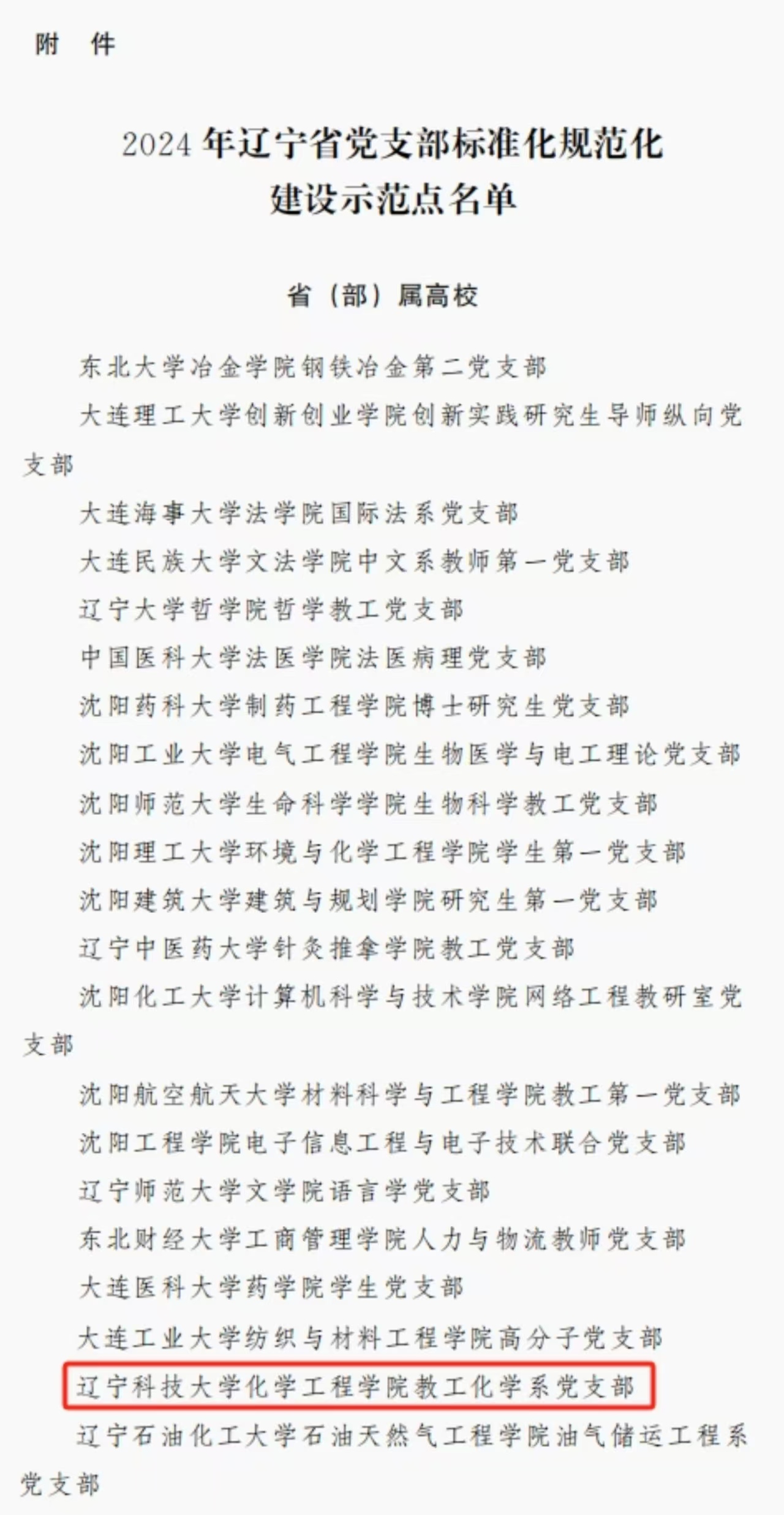 近日,中共辽宁省委组织部公布了2024年辽宁省党支部标准化规范化建设示范点的名单,开云登陆入口化学工程学院教工化学系党支部入选,辽宁省本科院校共获评23个。