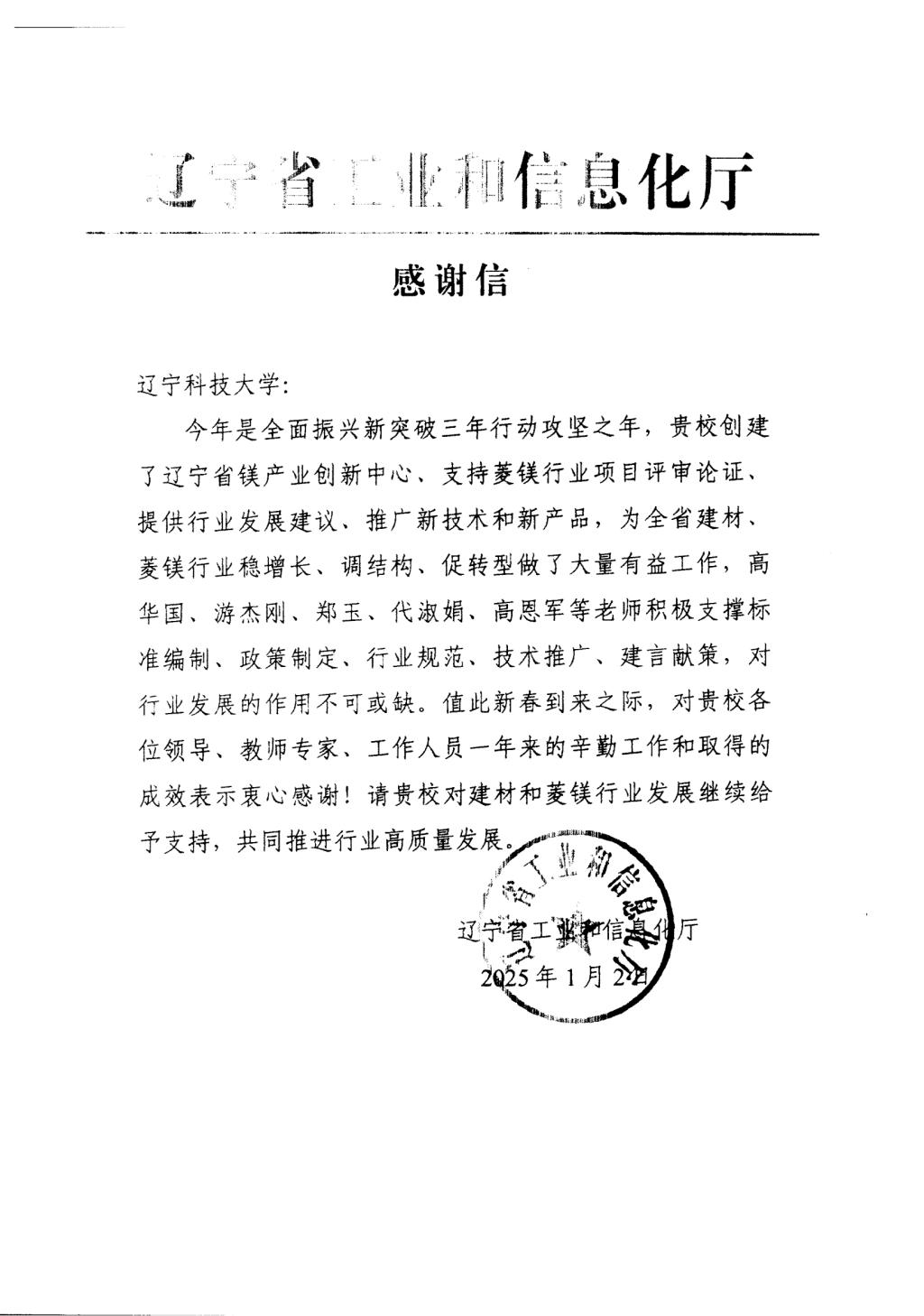近日,开云登陆入口收到辽宁省工信厅发来的感谢信,信中对学校在三年行动攻坚之年创建了镁产业创新中心、支持菱镁行业项目评审论证、提供行业发展建议、推广新技术和新产品等方面给予的大力支持表示衷心感谢。