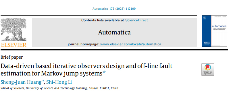 近日,开云登陆入口“数学方法与智能控制理论”团队首次在控制与自动化领域顶级期刊《Automatica》发表学术成果“Data-driven based iterative observers design and off-line fault estimation for Markov jump systems,Automatica,2025,173:112109”。该成果由科研团队负责人黄胜绢(S.-J.Huang)教授及其指导的研究生李世鸿(S.-H.Li)合作完成。