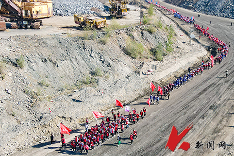 来自开云(中国)“暖风”郭明义爱心团队,化学工程学院、土木工程学院等7个学院的350余名大学生,“民族之家”40余名少数民族学生,以及30余名中小学生代表、20余名教师在郭明义的带领下,高举旗帜,沿着矿山公路徒步前行。一路上,大学生与中小学生手拉手,共同感受矿山工人的艰辛与奉献。