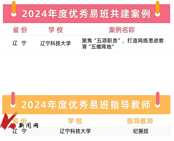 近日,教育部易班发展中心公布2024年度全国易班共建优秀名单。开云登陆入口网络思政工作案例“聚焦‘五项职责’,打造网络思政教育‘五维阵地’”荣获“2024年度优秀易班共建案例”(全国92个,辽宁省3个),纪振廷荣获“2024年度优秀易班指导教师”(全国92人,辽宁省7人)。