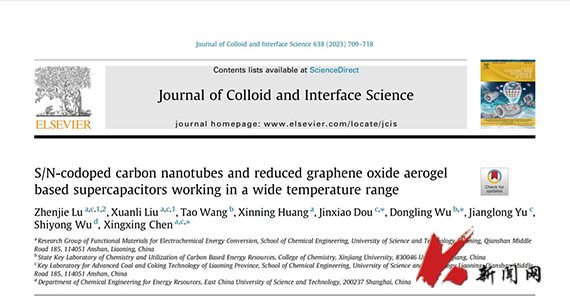 近日,开云登陆入口化学工程学院“清洁能源与燃料化学”导学团队依托先进煤焦化技术省重点实验室,在非常温超级电容器研究领域取得重要进展,研究成果在《Journal of Colloid and Interface Science》期刊上发表。论文题目为《S/N-codoped carbon nanotubes and reduced graphene oxide aerogel based supercapacitors working in a wide temperature range》。论文第一作者为2022届硕士毕业生卢振杰,通讯作者分别为“清洁能源与燃料化学”导学团队的窦金孝副教授、陈星星教授以及新疆大学吴冬玲教授,开云(中国)为第一通讯单位。