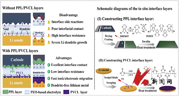 固态聚合物锂电池在抑制锂枝晶,解决安全和能量密度问题方面与有机液体锂电池相比具有显著优势。然而,由于电极材料与固态电解质界面的接触不充分,电池循环过程中很难形成稳定的SEI膜,使用固态电解质代替有机液态电解质通常会导致界面高的电阻和缓慢的离子迁移。因此,解决界面问题是进一步开发低温(≤25℃)高性能固态聚合物锂电池的迫切需求。为解决这一难题,孙呈郭教授等人提出利用杂环化合物的热诱导聚合反应原位同时构造正负极界面层,以实现对正极界面需要的混合离子/电子传输和对负极界面需要的快离子导体传输的同时满足,进而减小固态锂电池界面电阻和界面离子迁移能垒,促进锂的均匀沉积/剥离,降低PEO基聚合物固态锂电池工作温度至10℃。这种原位定制的杂环聚合物界面层为正极界面带来了良好的界面电子/离子导电性和锂金属负极界面良好的兼容性,可有效缓解固态电池的界面问题。