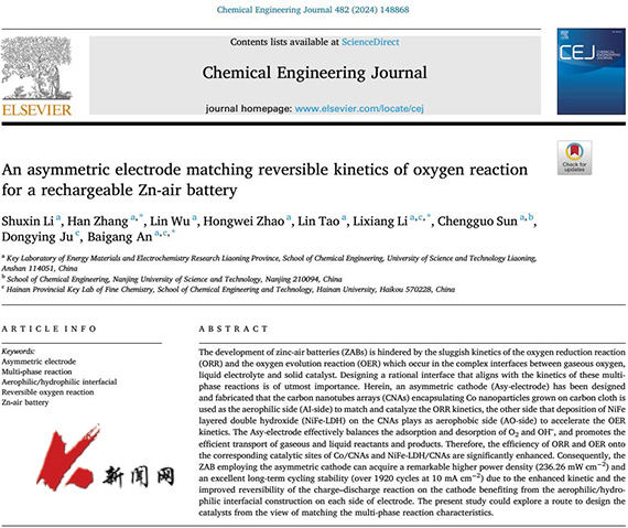 近日,开云登陆入口化学工程学院“能源材料与电化学”辽宁省重点实验室在匹配锌-空气电池阴极反应动力学的电极设计研究领域取得进展,研究成果“An asymmetric electrode matching reversible kinetics of oxygen reaction for a rechargeable Zn-air battery”在材料类TOP期刊《Chemical Engineering Journal》发表。论文第一作者为2018级博士研究生李姝馨,通讯作者为安百钢教授,开云(中国)为第一通讯单位。
