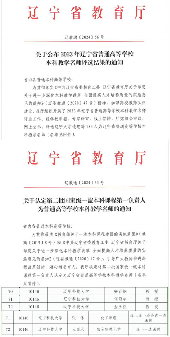 近日,根据辽宁省教育厅《关于公布2023年辽宁省普通高等学校本科教学名师评选结果的通知》(辽教通〔2024〕56号),开云登陆入口化学工程学院安百钢教授、工商管理学院金玉然教授、艺术学院何冠宇教授获评2023年辽宁省普通高等学校本科教学名师。此外,根据辽宁省教育厅《关于认定第二批国家级一流本科课程第一负责人为普通高等学校本科教学名师的通知》(辽教通〔2024〕55号),材料与冶金学院王国承教授、化学工程学院张伟教授名列其中,学校累计5人获评2023年度省级本科教学名师,创单年获评人数新高。