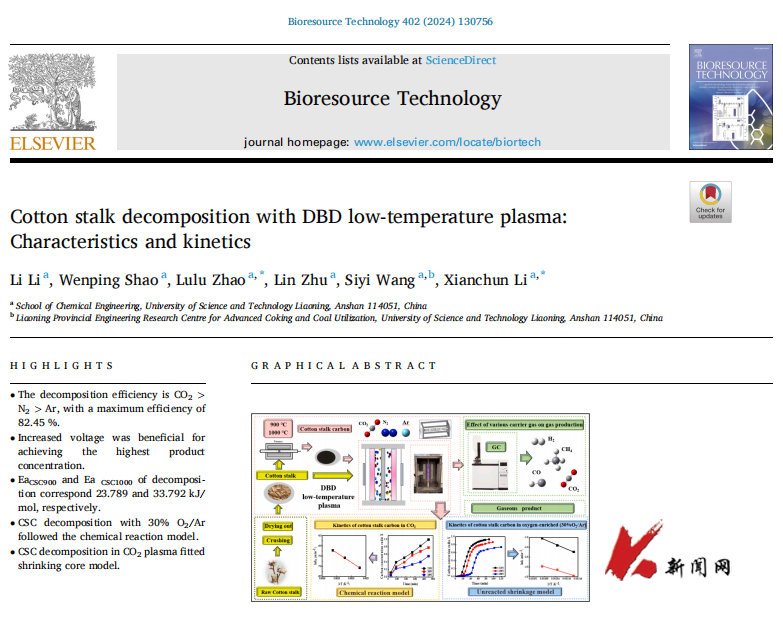 近日,开云登陆入口化学工程学院“热能工程与环境催化研究”团队在DBD低温等离子体技术处理棉秆的研究中取得重要进展。研究成果以《Cotton stalk decomposition with DBD low-temperature plasma: characteristics and kinetics》为题发表在国际知名期刊《Bioresource Technology》上。论文第一作者为化工2022级研究生李丽,通讯作者为“热能工程与环境催化研究”团队负责人李先春教授和赵璐璐老师。