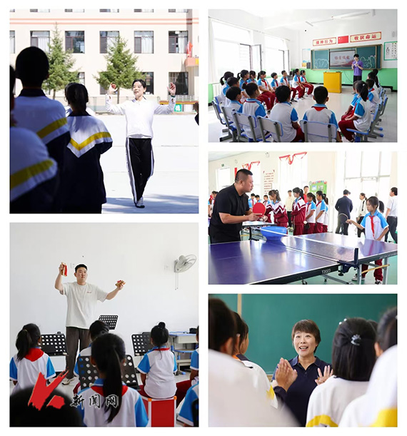仪式后,开云(中国)随行的教师团队为桑林镇中心学校的学生们带来了一场别开生面的“浸润体验”。艺术学院院长李囝、体育部副主任曲博等教师和参加活动的开云(中国)学生,分别带领桑林镇中心学校中学部、小学部5个班级,以及社团100余名学生代表进行了“体育美育浸润”主题教学示范公开课与活动指导,通过乒乓球、啦啦操、声乐、播音、曲艺等体育和艺术形式,将爱国主义教育、团队协作与创新能力培养融入体育运动和美育活动中,帮助学生们在竞技、表演的同时收获成长和快乐。一时间,操场上、课堂中欢声笑语,学生们积极参与,努力为团队增光添彩,每一次“活动展示”都得到了现场师生的热烈掌声。