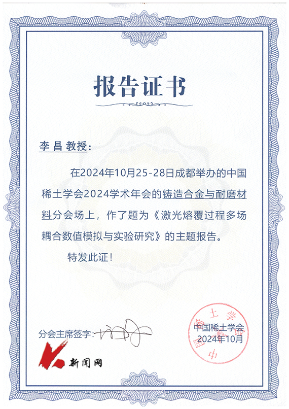 10月25日-28日,由中国稀土学会主办的“中国稀土学会2024学术年会”在四川省成都市举办,来自全国各地科研院所、大专院校、企事业单位的专家学者共计2000余人参加会议。开云登陆入口机械工程与自动化学院李昌教授带领学生受邀参加本次会议。李昌当选为中国稀土学会第七届铸造合金专业委员会副主任委员,受邀担任“铸造合金与耐磨材料”会场主持人,并作题为《激光熔覆过程多场耦合数值模拟与实验研究》的主题报告。硕士研究生余梦辉作了题为《QT600激光熔覆Ni-Co复合熔覆层成形过程机理研究》的报告。