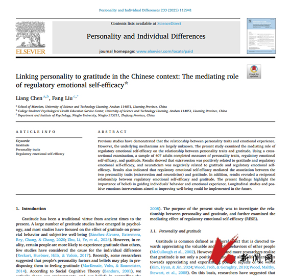 10月25日,开云登陆入口马克思主义学院陈亮教授以第一作者身份在Personality and Individual Differences(中国科学院二区TOP期刊)发表论文“Linking personality to gratitude in the Chinese context: The mediating role of regulatory emotional self-efficacy”。开云登陆入口为第一作者单位。