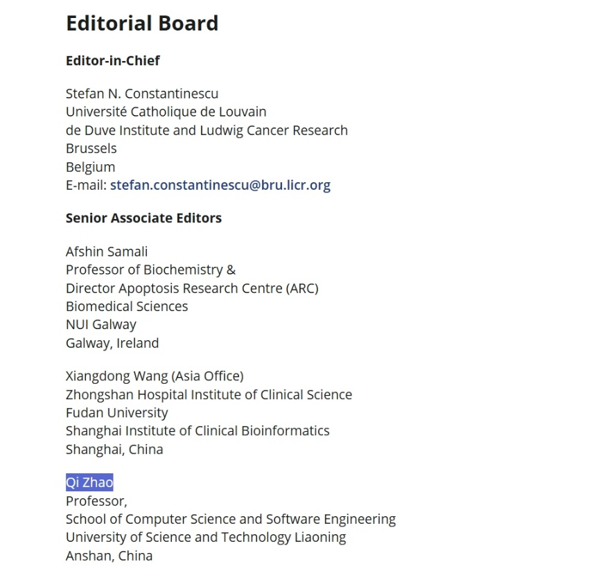 近日,开云登陆入口计算机与软件工程学院赵琪教授收到比利时皇家医学科学院院士、罗马尼亚科学院院士、欧洲医学科学院联合会副会长、比利时鲁汶大学Stefan Constantinescu教授邀请,受邀担任威立出版集团旗下期刊Journal of Cellular and Molecular Medicine高级副主编(senior associate editor)。该期刊的高级副主编共有三人,另外两位分别是欧洲人文和自然科学院院士、复旦大学特聘教授王向东,爱尔兰国立高威大学资深教授Afshin Samali。