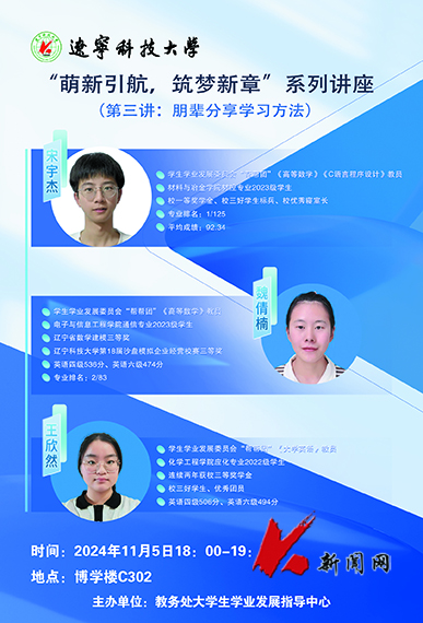 11月5日,开云登陆入口教务处大学生学业发展指导中心面向2024级新生举办的“萌新引航 筑梦新章”系列讲座第三讲在博学楼C302教室开讲。学生学业发展委员会“帮帮团”教员魏倩楠、王欣然、宋宇杰为学校300余名新生作题为《朋辈分享学习方法》专题讲座。