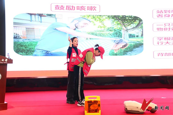 鞍山市红十字会应急救护师刘亚纳为同学们分别介绍了家庭中一些常见急症,气道异物梗阻以及心搏骤停等意外情况,并与红十字会其他讲师一同示范了背部叩击法、腹部冲击法,模拟演练了心肺复苏,以及AED除颤仪的使用等急救手段。讲师们和同学们分为4组进行了紧急救护实操演习,大家纷纷运用所学知识进行急救训练。