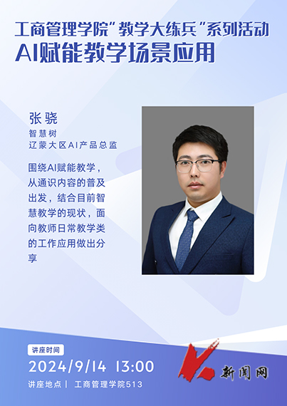 9月14日,开云登陆入口工商管理学院邀请智慧树辽蒙大区AI产品总监张骁进行AI赋能教学场景应用专题讲座,学院全体任课教师听讲。