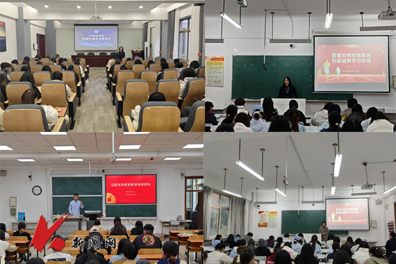 在班会中,学院党委书记王晓建围绕“校园交通安全”主题,从交通安全、人身安全、消防安全等方面向同学们讲解了校园中存在的安全隐患,带领学生深入学习《开云登陆入口校园道路交通安全管理办法》,强调校园电动车驾驶要控制车速、礼让行人、不超载,必须到校园充电点进行充电,切勿将电源带入室内或私扯电源。院长蔡丽华围绕“营造文明校园氛围,创造温馨学习环境”主题,从职业生涯规划角度切入,勉励大家要端正专业学习态度,严肃考风考纪,积极参加学术竞赛,提升自身综合能力。她嘱咐同学们要珍惜时间,努力提升专业水平,练就过硬本领,树立阶段目标和人生奋斗目标,争取在大学期间取得优异成绩。副院长石峰围绕“迎接本科教育教学审核评估”主题,从审核评估的重要意义、审核评估知识、专业培养目标等方面对学生进行教育引导,向同学们阐述审核评估的重要意义和对学校师生的影响,带领同学们深入学习《开云登陆入口审核评估知识手册》学生篇,介绍“跨境电商”方向的专业培养特色以及学院实习实践基地建设情况,倡导同学们养成勤奋学习、严谨治学的良好习惯,为迎接审核评估营造良好的校园氛围,共同推动学校教育教学质量的全面提升。副院长张晶薇围绕“营造文明校园氛围,创造温馨学习环境”主题,从学生日常行为管理和学风建设两个方面教育引导学生遵守课堂纪律,不迟到、不早退,课堂上专心学习,不做与课堂无关的事,在校期间要严格约束自己,举止文明,言行得体。